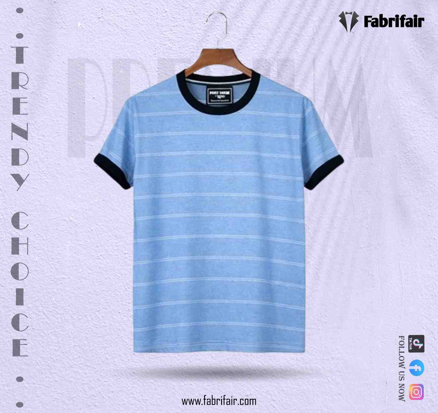 Mens Premium Cotton T-Shirt - Sky Blue with White Stripes